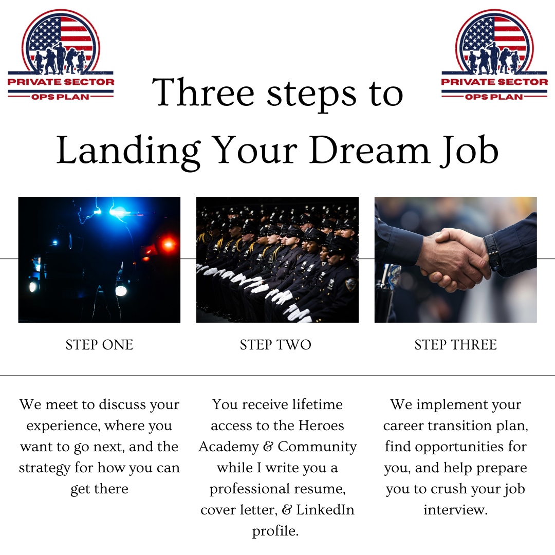 I'm Colin, CEO & Founder of Recruiting Heroes LLC, best-selling author, and former Deputy Sheriff. Like you, I come from a life of service and know the challenges of finding a career after the uniform. When I built the Private Sector Ops Plan, I thought of all the things I wish I had during my career transition. I know that this program will help you as it as helped so many other law enforcement officers.